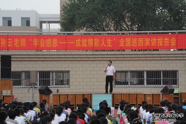 孙老师从感恩伟大的母亲——祖国开始讲起,讲到感恩自己的父母。孙老师讲到感人之处,扣动全场所有同学、老师、家长的心弦。所有同学高举双手,齐声呼喊:“爸爸妈妈,我爱你们”。喊声震天,持续不断,家长们流出了幸福的、激动的泪花。几十位主动上台互动的同学,勇敢的向他们的爸爸妈妈、向现场所有的人喊出了自己的心声,道出了平时父母对自己的关心和呵护,后悔平时自己从来没有回报过他们的爸爸妈妈,也从来没有向他们感恩。互动的同学们牵着父母的手,不断的大声呼喊:“爸爸妈妈,我爱你们”。